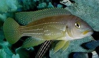 基质繁殖型,但非一夫一妻制(倾向一夫二妻制),雌鱼选择的产卵地点靠近岩石或壳,典型情形下是将几乎被沙埋掉的扁平石头底下的沙移去,因此繁殖窝挖好后扁石块便盖在洞口上,卵便产在石块上因此常不易见到,一般约150颗,约2-3天孵出,有时沙地上并无大石块而是粗沙或混杂贝壳,但是因为沙中富含矿物质沉积物,因此可多少将沙胶结在一起而仍可让珍珠雀挖洞,甚至有时珍珠雀还会善用这种性质挖一个专们照顾幼鱼的小窝,由雌鱼照顾而公鱼在外护卫,此时的亲鱼会出现数道暗色宽条纹而容易辨识,但幼鱼很早就会离开亲鱼,人工繁殖时在产卵后约11-12天便可自行游动,此时可以拿丰年虾无节幼虫或水蚤幼虫喂食。