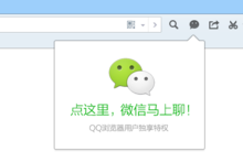 安装完“QQ浏览器微信版”之后,首次启动浏览器时,会在右上角工具栏按钮上出现微信按钮,以及“微信马上聊”的小气泡: