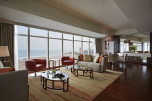 位于酒店26层的主席套房,面积达420平方米,可称是青岛最豪华的酒店套房——中西合璧的设计理念与精雕细琢的室内装修完美糅合,并配置顶级、齐备的先进设施及私属的室外观海露台,270度全方位领略迷人的山海景致以及海滩风光。独立的卧室、餐厅、厨房、酒吧、健身室、按摩室等一应俱全,彰显宾客的尊贵身份与不凡品味。面积达168平方米的总统套房配置顶级奢华配套设施并拥有私属室外观海露台,为宾客提供更多选择。