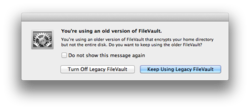 如果迁移了通过更低版本的 FileVault 进行加密的个人目录,您将无法打开 FileVault 2。请参阅下面的“从更低版本的 Mac OS X 中迁移受 FileVault 保护的个人目录”部分了解更多信息。