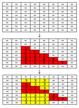 Z buffer 的原理非常简单。在绘制 3D 场景时,除了存放绘制结果的 frame buffer 外,另外再使用一个额外的空间,也就是 Z buffer。Z buffer 记录 frame buffer 上,每个 pixel 和观察者的距离,也就是 Z 值。在开始绘制场景前,先把 Z buffer 中所有的值先设定成无限远。然后,在绘制三角面时,对三角面的每个 pixel 计算该 pixel 的 Z 值,并和 Z buffer 中存放的 Z 值相比较。如果 Z buffer 中的 Z 值较大,就表示目前要画的 pixel 是比较近的,所以应该要画上去,并同时更新 Z buffer 中的 Z 值。如果 Z buffer 中的 Z 值较小,那就表示目前要画的 pixel 是比较远的,会被目前 frame buffer 中的 pixel 遮住,所以就不需要画,也不用更新 Z 值。这样一来,就可以用任意的顺序去画这些三角面,即可得到正确的绘制结果。下图是一个例子: