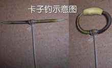 卡钓是传统钓法里想象力比较丰富,有充分利用弹力原理的一种钓法。卡子一般都是用竹片制成。卡钩是用富有弹性的毛竹桠枝制成,卡箍内装饵料,鱼吃卡食时要够卡箍,卡箍两头卡尖弹开,卡住鱼的口腔。卡钓法主要用于钓鲤鱼、鲫鱼、鳊鱼等底层鱼。