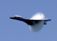 除此之外,由于在物体的速度快要接近音速时,周边的空气受到声波叠合而呈现非常高压的状态,因此一旦物体穿越音障后,周围压力将会陡降。在比较潮湿的天气,有时陡降的压力所造成的瞬间低温可能会让气温低于它的露点(Dew Point)温度,使得水汽凝结变成微小的水珠,肉眼看来就像是云雾般的状态。但由于这个低压带会随着空气离机身的距离增加而恢复到常压,因此整体看来形状像是一个以物体为中心轴、向四周均匀扩散的圆锥状云团。