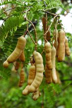(傣语)、酸果、麻夯、 甜目坎、通血图。苏木科酸角属。热带、亚热带常绿大乔木,该属仅含酸角1种两个类型:甜型和酸型。[1]树身高大,树干粗糙,枝叶扶疏,枝头挂着一串串、一嘟噜褐色的弯钩形荚果。酸角喜欢炎热气候,生长在年均气温18ºC—24ºC,年降雨量500—1200毫米的地区。主要分布于云南金沙江、怒江、元江干热河谷及西双版纳一带,海拔50~1350米的热量好的地方。川滇两省境内的金沙江干热河谷是我国酸角的主要产区,年产酸角100吨,单产、品质、风味都优于省内其它地区。[2]木质有硬质的黑红色的心材和软质黄色的白色的边材素有“东方神树”之称。